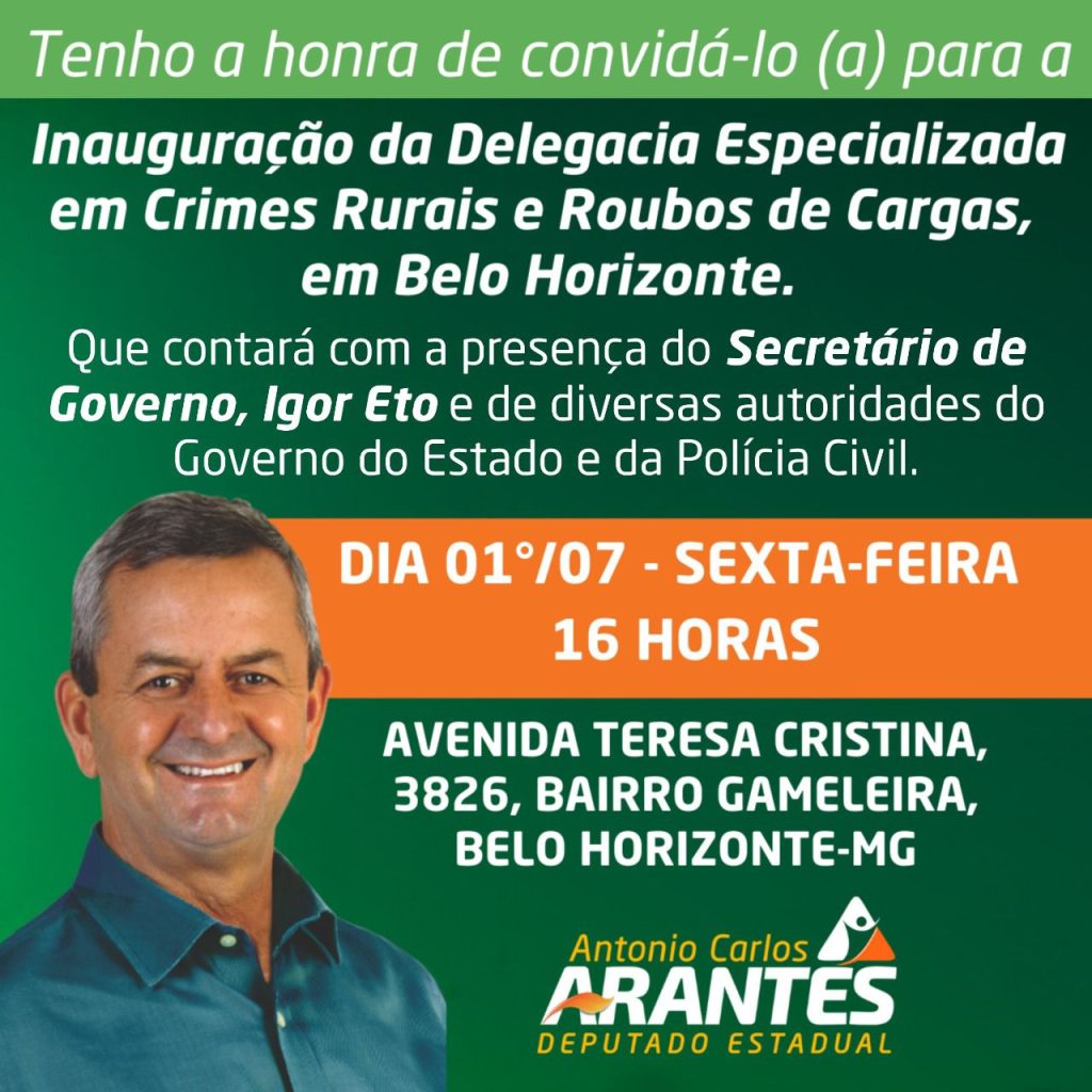 O deputado Arantes faz questão de convidar a todos para a inauguração: “Essa delegacia é de grande importância para o agronegócio e para o transporte de cargas no estado. Localizada num ponto estratégico, numa sede moderna, ampla e funcional, permitirá o controle das ações policias em todo o estado. Vamos aumentar a proteção a quem trabalha no campo. Agradecemos ao governador Romeu Zema e sua equipe que atenderam aos nossos pedidos e também às instituições que contribuíram para a reforma e instalação da DEICRA”, afirmou.