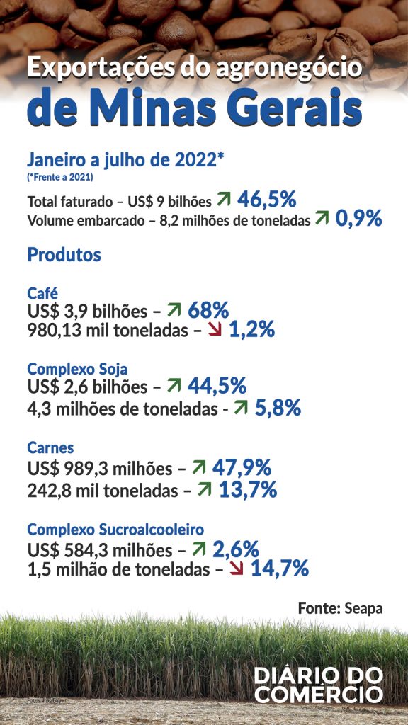 Dentre os itens embarcados para o exterior, destaque para o café, complexo soja e grupo das carnes. De acordo com os dados da Secretaria de Estado de Agricultura, Pecuária e Abastecimento (Seapa), as exportações do setor responderam por 37,7% do faturamento gerado com os embarques totais feitos por Minas Gerais no período, que foi de US$ 23,8 bilhões e ficou 4,6% maior.