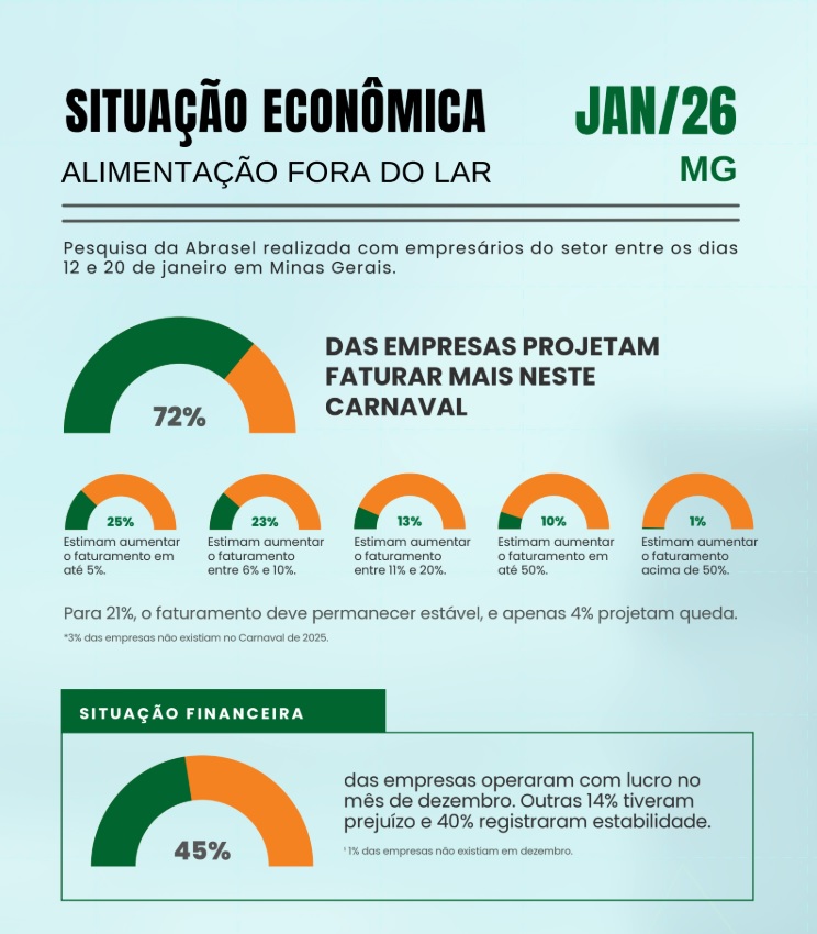 Um levantamento da Abrasel nacional, que considera todas as regiões brasileiras, mostra um ambiente financeiro mais favorável no encerramento de 2025, que deve refletir positivamente em 2026. Em dezembro, 47% dos empresários relataram lucro, enquanto 36% operaram em equilíbrio. Outros 16% fecharam o mês no prejuízo. O número de empresas no azul é o mais elevado dos últimos dois anos, apenas 1% abaixo do registrado em janeiro de 2024.