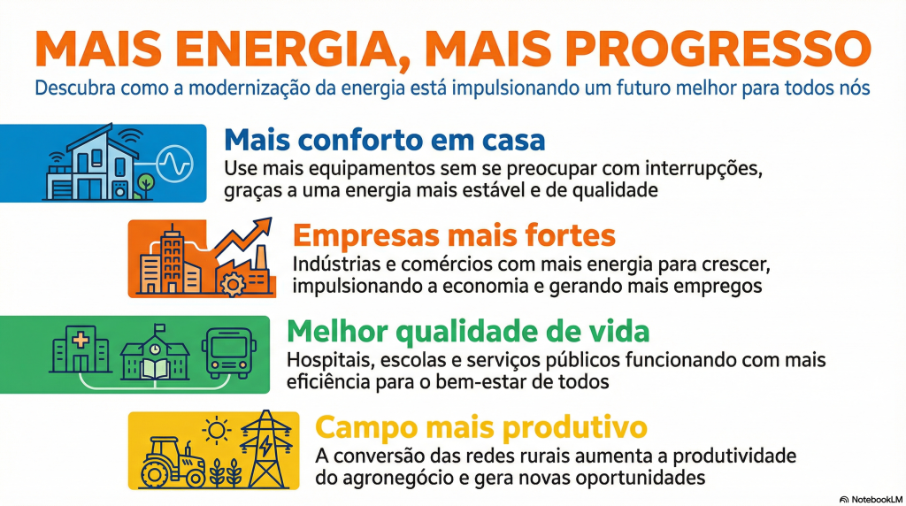 Essas cifras se traduzem em mais energia para o produtor rural, a indústria e o comércio. Os recursos são destinados a melhorias que atendem a todos os clientes, pois proporcionam aumento da capacidade de geração de energia, expansão e modernização da rede de distribuição, aprimoramento da rede de transmissão e avanços em inovação e tecnologia.