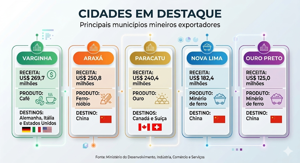 Cinco cidades responderam por mais de um terço das exportações de Minas Gerais em fevereiro, quando o Estado se consolidou como o segundo maior exportador nacional, atrás apenas de São Paulo. As cidades de Varginha, Araxá, Paracatú, Nova Lima e Ouro Preto responderam por US$ 1,2 bilhão das vendas estaduais para outros países no mês, que alcançaram US$ 3,3 bilhões no total.