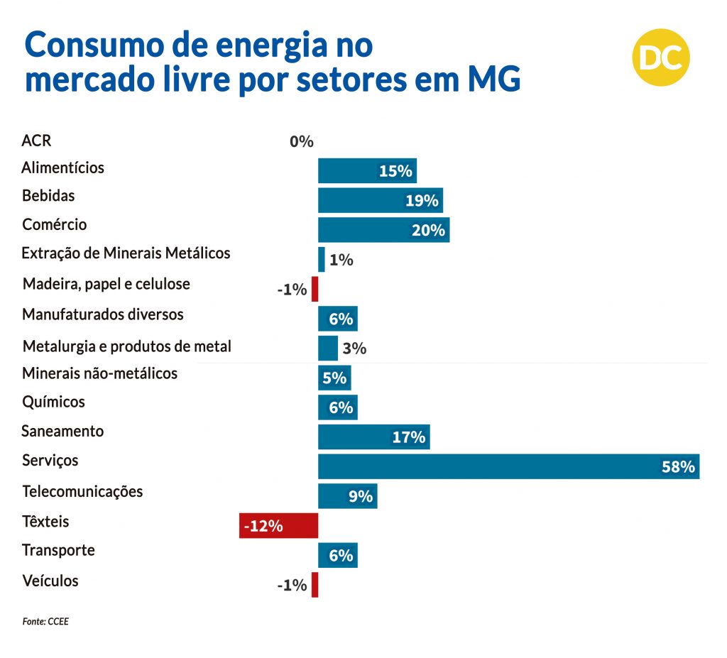Ainda em Minas Gerais, também se destacaram no consumo de energia elétrica: empresas de bebidas (19%), saneamento (17%), alimentos (15%), telecomunicações (9%), manufaturados diversos (6%), químicos (6%), transportes (6%) e extração de minerais metálicos (5%).