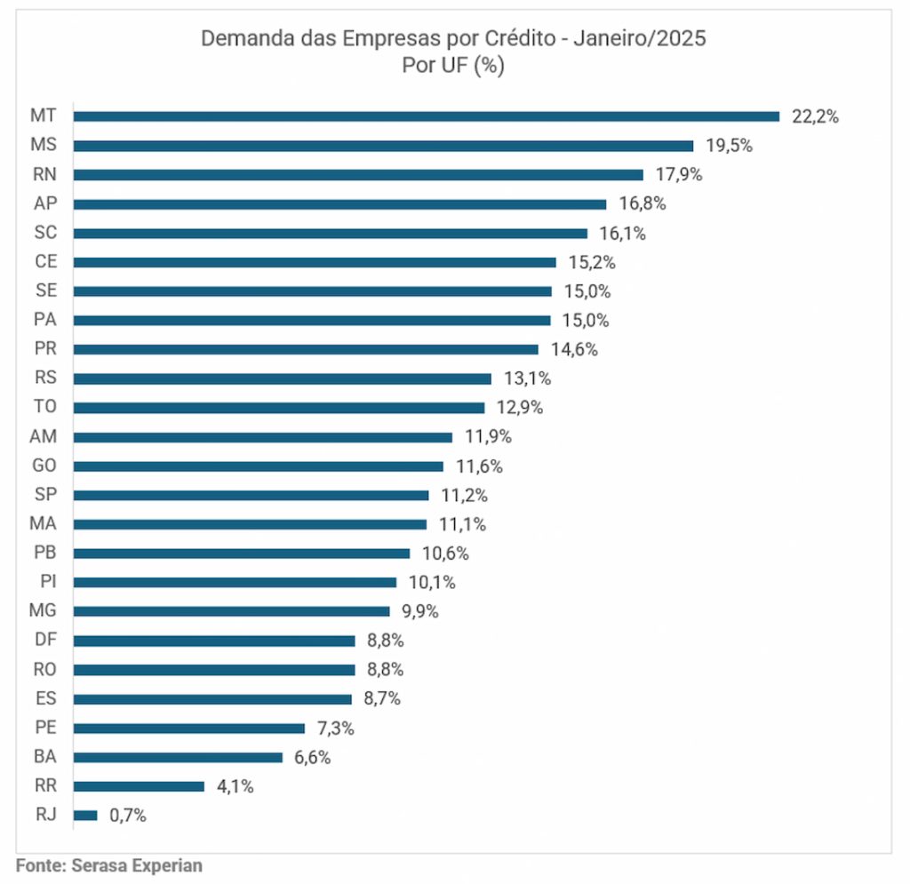 Em janeiro, todas as Unidades Federativas brasileiras registraram crescimento na busca por crédito. Mato Grosso foi o destaque (22,2%), seguido por Mato Grosso do Sul (19,5%) e Rio Grande do Norte (17,9%).