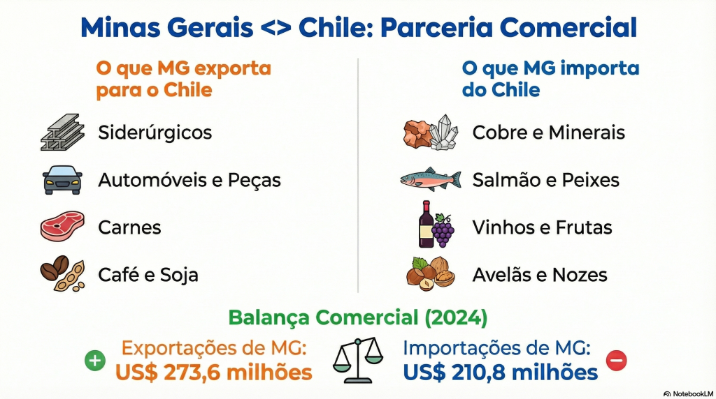 As exportações mineiras para o país andino representaram, em 2024, US$ 273,6 milhões, com destaque para produtos siderúrgicos, automóveis e alimentos. Já os chilenos enviaram para Minas Gerais US$ 210,8 milhões, principalmente em fios de cobre, salmão, avelãs e ferro-molibdênio.