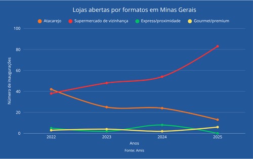 Os dados da Amis demonstram que, entre os anos de 2022 e 2025, os atacarejos deixaram de responder por quase metade (47,19%) das aberturas de lojas em Minas Gerais para ficar com uma participação de 12,75% das inaugurações realizadas. Por outro lado, o segmento de supermercados de vizinhança vem ganhando cada vez mais espaço.