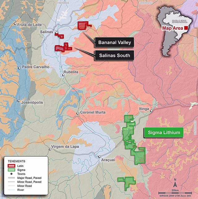A Latin Resources Limited, empresa de exploração mineral com sede na Austrália, levantou 35 milhões de dólares australianos para investir em um projeto de lítio no Brasil, entre outras iniciativas. Trata-se do projeto Salinas Lithium, localizado no Norte de Minas Gerais, que envolve duas áreas de prospecção: Vale do Bananal, com 1.250 hectares; e Salinas Sul, com 4.088 hectares.