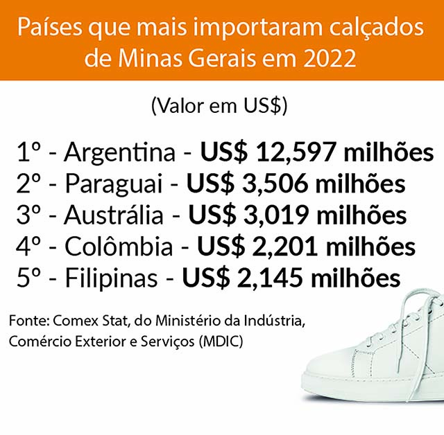 Quase a totalidade das exportações partiram do polo de Nova Serrana, na região do Centro-Oeste do Estado. O presidente do Sindicato Intermunicipal das Indústrias de Calçados de Nova Serrana (Sindinova), Ronaldo Andrade Lacerda, destaca que as vendas externas do polo aumentaram nos últimos anos. Segundo ele, os embarques anuais saltaram de cerca de US$ 12 milhões em 2019 para mais de US$ 36 milhões em 2022.
