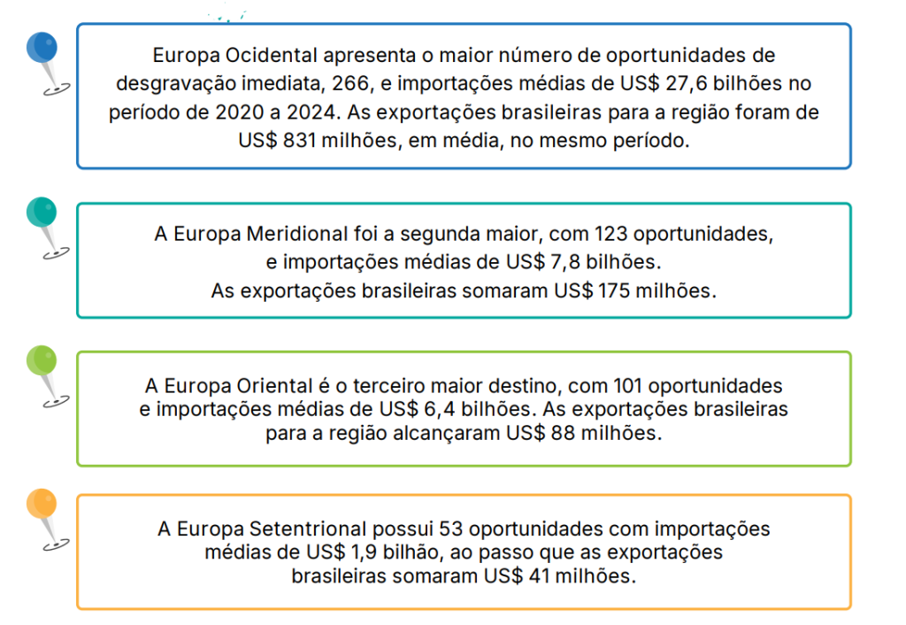 A Agência Brasileira de Promoção de Exportações e Investimentos (ApexBrasil) publicou um estudo sobre as oportunidades de negócios para os setores produtivos brasileiros com o acordo Mercosul-União Europeia. O levantamento identifica 543 oportunidades de desgravação tarifária (eliminação ou redução gradual de tarifas entre países que firmaram um acordo comercial) em 25 países da UE, destacando setores como máquinas e equipamentos, produtos químicos, artigos manufaturados e alimentos.