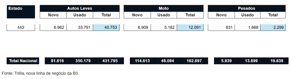 O mercado mineiro de veículos automotivos começou bem para os revendedores e financiadores. Minas Gerais registrou um aumento de 7,3% em janeiro de 2026 em relação ao mesmo período de 2025 nos financiamentos de veículos, de acordo com dados da Trillia, empresa de dados da B3, ligada à Bolsa de Valores. O total de veículos financiados, na soma de novos e usados, foi de 55.143. Assim, Minas Gerais ocupa a segunda posição no ranking nacional de financiamentos veiculares, representando 9% do total do País, que registrou 614.130 financiamentos.
