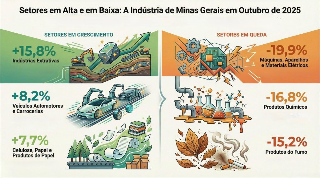 Apesar do resultado positivo, a indústria mineira enfrenta desafios pontuais. O levantamento do IBGE aponta quedas significativas em segmentos de relevância, como máquinas e equipamentos, que liderou o recuo da indústria de Minas Gerais em outubro (-19,9%), seguido por produtos químicos (-16,8%) e produtos do fumo (-15,2%).