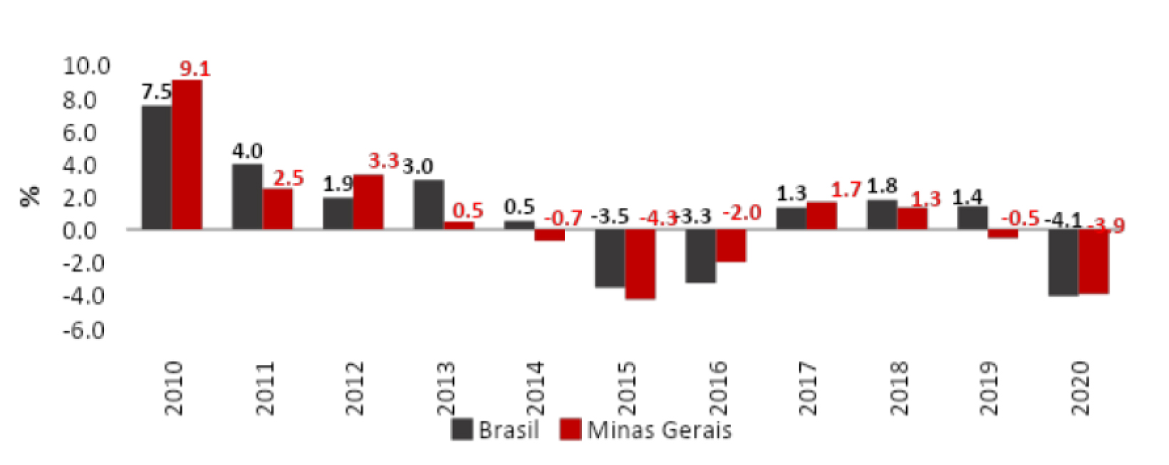 Para se ter uma ideia, o recuo do PIB mineiro no ano passado foi o segundo mais representativo da última década. A retração mais intensa foi registrada em 2015 (-4,3%), durante a crise verificada entre os anos de 2014 e 2016.