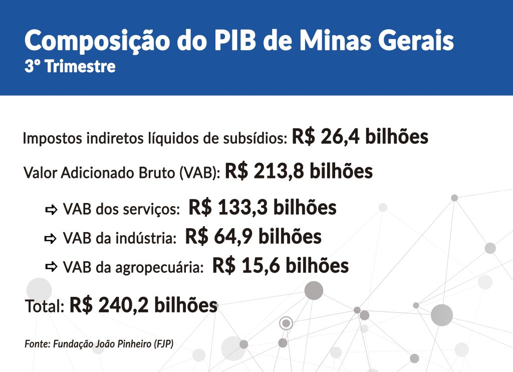 A Fundação João Pinheiro (FJP) divulgou ontem os dados do Produto Interno Bruto (PIB) de Minas Gerais no terceiro trimestre de 2022. O valor total de bens e serviços produzidos pelo Estado foi de R$ 240,2 bilhões, o que representa 9,4% do montante nacional. O resultado aponta queda de 2,8% se comparado ao trimestre imediatamente anterior. Apesar do recuo, houve crescimento de 3,9% em relação ao mesmo período do ano passado e expansão de 4,2% no acumulado do ano até setembro, chegando a R$ 691,4 bilhões.