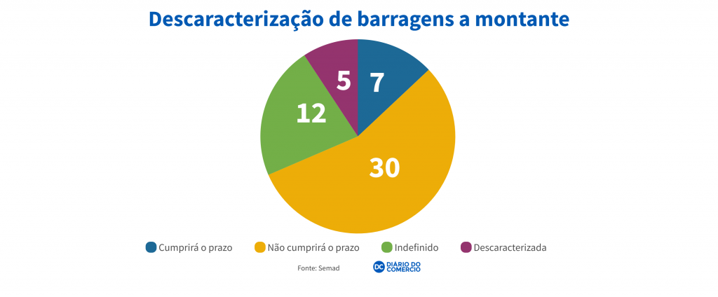 Embora a lei determine que todas as barragens a montante existentes no Estado sejam descaracterizadas até o dia 25 do próximo mês, nem um terço será descomissionado no prazo. Das 54 estruturas acompanhadas pela Secretaria de Estado de Meio Ambiente (Semad), 42 já declararam que não irão cumprir a data definida pela Lei 23.291/2019. O Ministério Público de Minas Gerais (MPMG) acompanha a situação e diz que os descumprimentos, passíveis de sanções, serão analisados caso a caso.