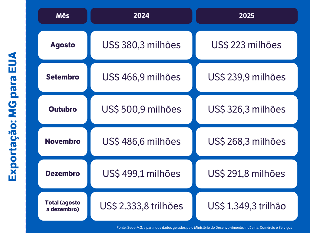 Ainda conforme a Sede-MG, a lista dos cinco itens mais exportados de Minas para os Estados Unidos sofreu alterações após a entrada em vigor das sanções, em agosto de 2025. Enquanto os três primeiros colocados não foram modificados, o item que ocupava a quarta posição (tubos e perfis ocos, sem costura, de ferro ou aço) saiu da lista.