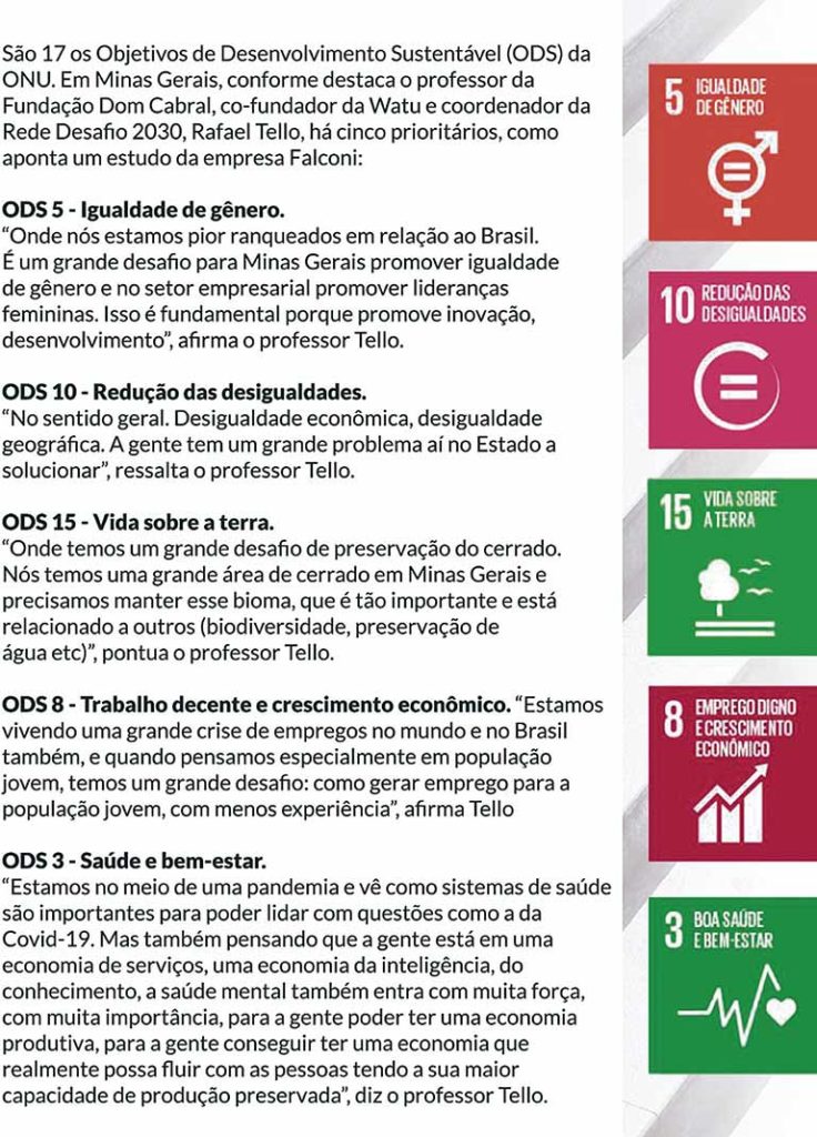 Professor da FDC, cofundador da Watu e coordenador da Rede Desafio 2030, Rafael Tello defende que a continuidade do desenvolvimento industrial em Minas Gerais precisa ser pensada levando em consideração os grandes desafios da humanidade, que estão sintetizados nos 17 Objetivos de Desenvolvimento Sustentável (ODS) da Organização das Nações Unidas (ONU).