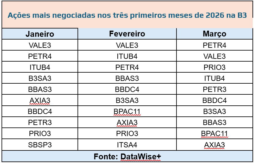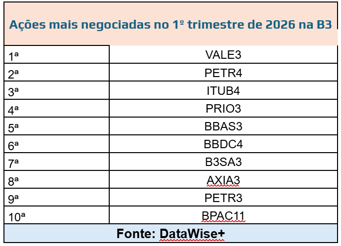 No primeiro trimestre do ano, o DataWise+ mostrou que Vale (VALE3), Petrobras (PETR4) e Itaú Unibanco (ITUB4) foram as três ações mais negociadas. Confira o ranking completo das dez ações mais negociadas no período: