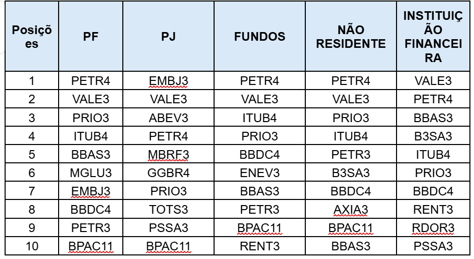 “Quando você vê Vale, Petrobras e bancos liderando esseranking, você está vendo basicamente o reflexo de três coisas. Commodities fortes, cenário global e ainda sensível. Um cenário global sensível e juros impactando diretamente o setor financeiro. Liquidez é o ponto importante, estamos no momento complexo de liquidez no mercado totalmente, no mercado todo. Então essas ações lideram não só porque elas são grandes, mas porque elas têm um volume suficiente de entrada e saída de players institucionais, isso gera movimentação e gera oportunidade”, completa.