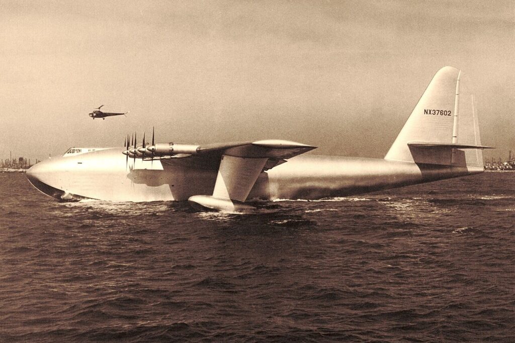 Feito de madeira compensada e avaliado em 23 milhões de dólares na época, o avião chegou a 161 km/h e a 21,3 metros de altura, em um voo que percorreu 1,6 km. Apesar de ter sido um momento histórico, o avião nunca mais conseguiu decolar, enterrando os planos de Hughes para ele fosse usada para transportas tropas e equipamentos durante a guerra.