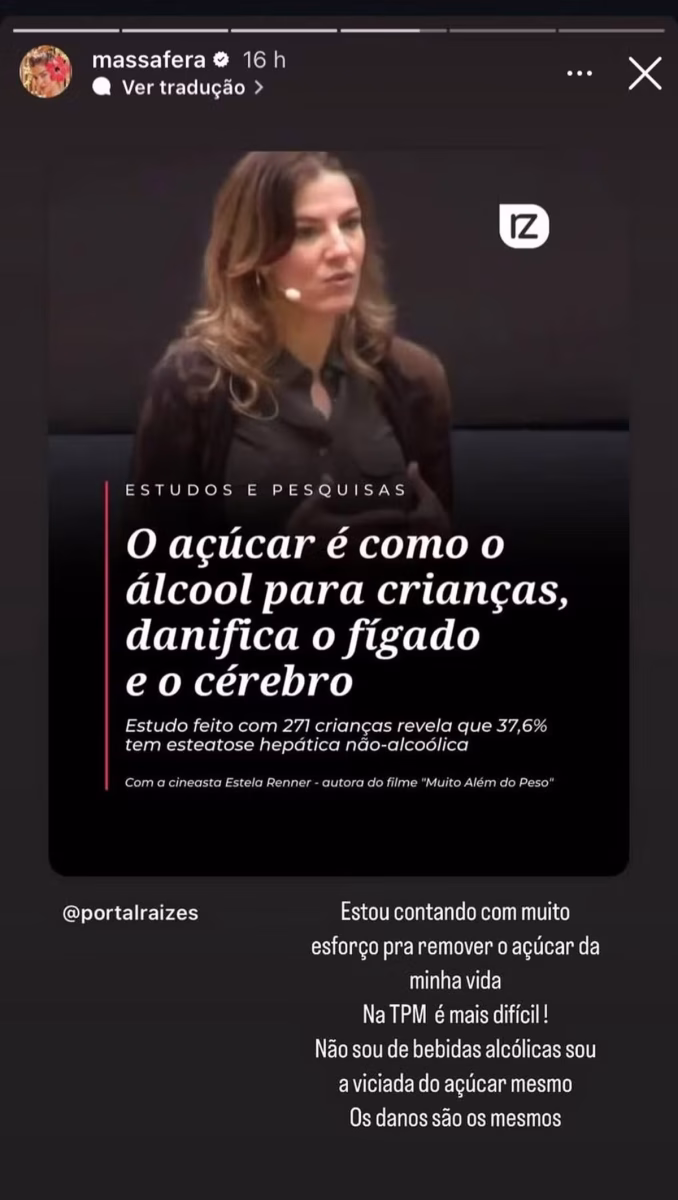 “Estou contando com muito esforço para remover o açúcar da minha vida”, escreveu a atriz. Em seguida, compartilhou uma frase dizendo que “o açúcar é como álcool para as crianças, danifica o fígado e o cérebro”.