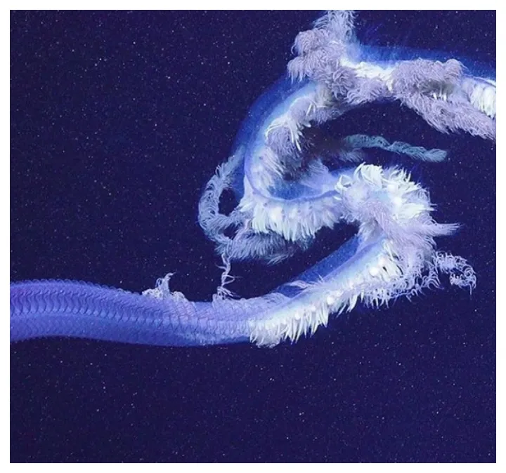 O organismo identificado pertence ao gênero Apolemia e integra o grupo dos sifonóforos, criaturas que, apesar da aparência de um único animal, são na verdade colônias formadas por milhares de organismos interdependentes. Cada uma dessas unidades, chamadas zooides, desempenha funções específicas, como alimentação, locomoção e reprodução, atuando de forma coordenada.