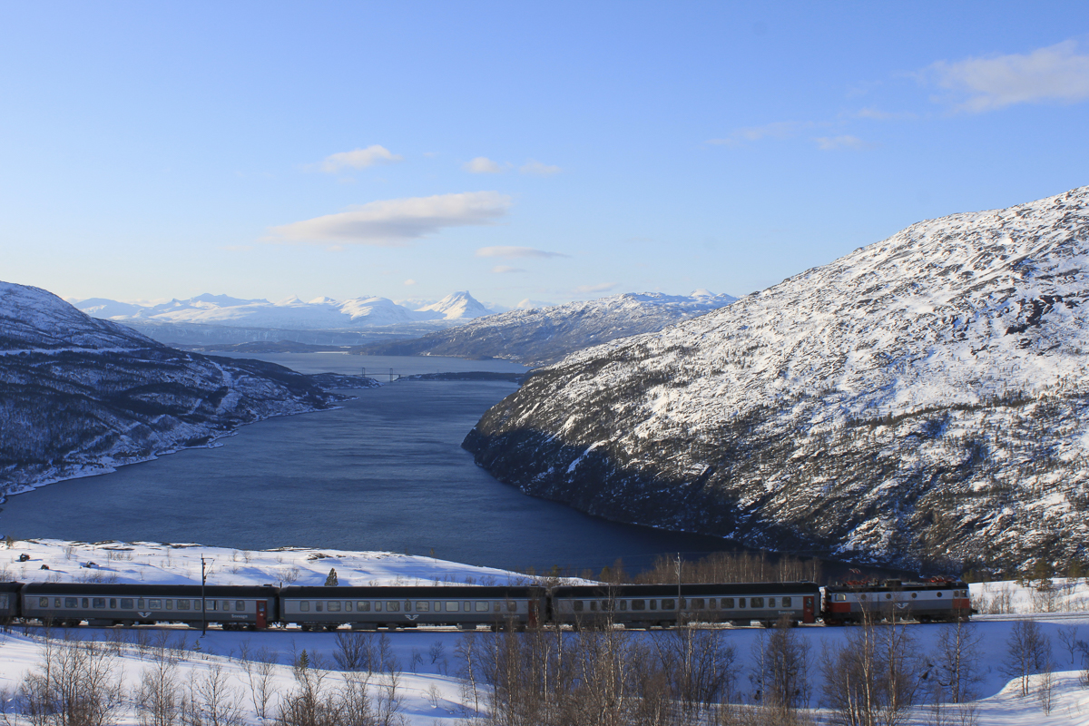 A rota oferece vistas contínuas do fiorde azul-gelo de Narvik, cachoeiras congeladas, vales isolados e montanhas dramáticas. O trem avança lentamente em trechos mais altos, permitindo que os turistas fotografem e contemplem a paisagem em total silêncio — quebrado apenas pelas explicações do guia a bordo sobre geologia, história e curiosidades locais.