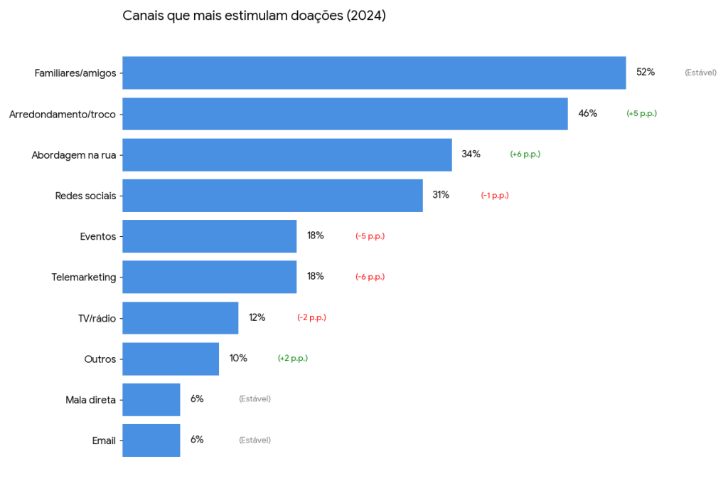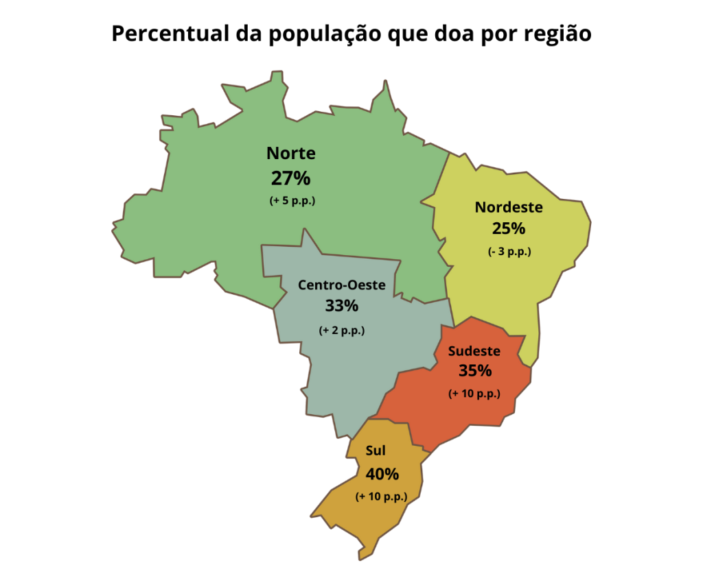 Enquanto o Sul e o Sudeste lideram com as maiores taxas de doação e um forte crescimento (+10 p.p.), o Nordeste é a única região que apresentou queda no percentual de doadores (-3 p.p.). Já o Norte e Centro-Oeste apresentaram crescimento, mas ainda possuem taxas menores que o Sul/Sudeste.
