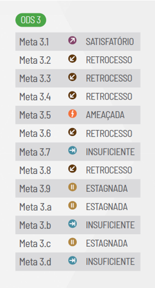 Das 169 metas dos ODS, divididas nos 17 ODS, cerca de 8% – 13 metas -, estão no ODS 3. Dessas 13, 69,5% tiveram desempenho negativo, estando cinco metas em retrocesso (39%), três insuficientes (23%) e uma ameaçada (7,5%). Já outras três metas estão estagnadas (23%) e os resultados positivos concentram apenas 7,5%, apenas uma meta, com resultado satisfatório.