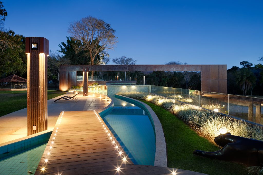 A demanda dos clientes era desafiadora e acabou se tornando o diferencial do projeto: “Alguns elementos foram cuidadosamente desenvolvidos para promover a integração harmoniosa entre a arquitetura e a paisagem, a conexão entre os espaços a serem habitados e a natureza preservada do paredão de pinturas rupestres. O conceito para o desenvolvimento e implantação do Espaço de Convivência sempre foi norteado por uma linha imaginária que faria a ligação entre a sede da fazenda existente e o monumento de formação rochosa. Toda a premissa foi desenvolvida através dessa linha, que no exercício do projeto, se concretizou no pórtico de aço corten. Tal elemento delimita o espaço de implantação da área de lazer e passa a fazer a interligação entre sede e formação rochosa”, explica Vanessa Lacerda.