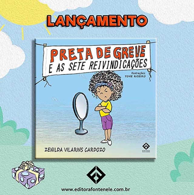 O livro “Preta de Greve e as sete Reivindicações” conta a história de Pérola Preta, uma menina negra que até frequentar a escola se sente linda e feliz, representada nos espaços cotidianos de sua convivência, porém ao iniciar a vida escolar conhece o preconceito quanto as suas características étnico raciais. (Preta de Greve e as sete Reivindicações, Zenilda Vilarins Cardozo, Fontelele Publicações, 23 páginas, R$ 40)