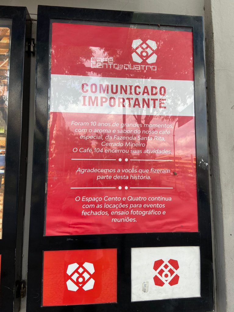 O espaço Cento e Quatro anunciou o encerramento das atividades do Café 104 no tradicional edifício localizado na Praça Rui Barbosa, nº 104, no Centro de Belo Horizonte. O aviso do encerramento das atividades da cafeteria foi fixado em uma das entradas do prédio nesta semana. A notícia põe fim a uma história que já durava dez anos na capital mineira.