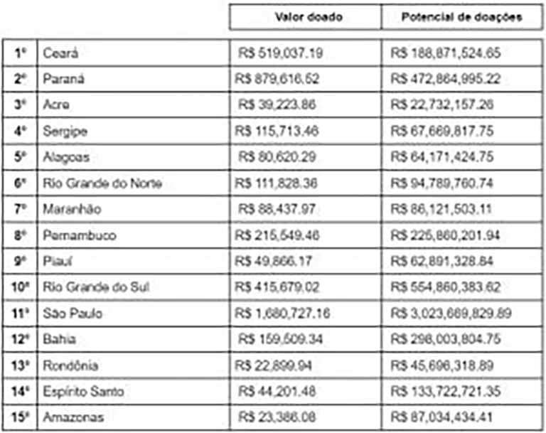 Em primeiro lugar no ranking dos Estados que, proporcionalmente, mais realizaram doações, está o Ceará, onde dos quase 9 milhões de habitantes apenas 402 dos declarantes doaram. São Paulo, Estado mais populoso e rico do país, aparece na 11ª posição. Isso porque o Estado, que poderia ter arrecadado pouco mais de R$ 3 bilhões, levantou apenas 0,06% deste potencial.