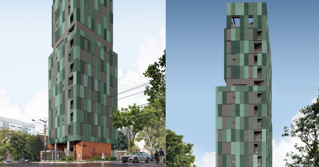 O projeto possui fachada ativa, com espaços comerciais e área de fruição que promovem a conexão com a rua. O edifício contará com 42 apartamentos no modelo studio, com áreas que variam de 30 a 72 metros quadrados (m²), e quatro lojas de 26 a 52 m², além de um rooftop wine bar com vista para a cidade.
