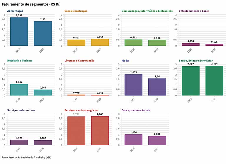 Do outro lado, setores tradicionais do mercado de franquias em Minas amargaram resultados desastrosos no Estado. “Hotelaria e Turismo” caiu 49% em faturamento. E o sempre resiliente “Alimentação” sofreu com o fechamento das operações de shopping center, caindo 13,8%. E deve sofrer ainda mais agora, com a onda roxa, que proibiu as retiradas na porta dos estabelecimentos.