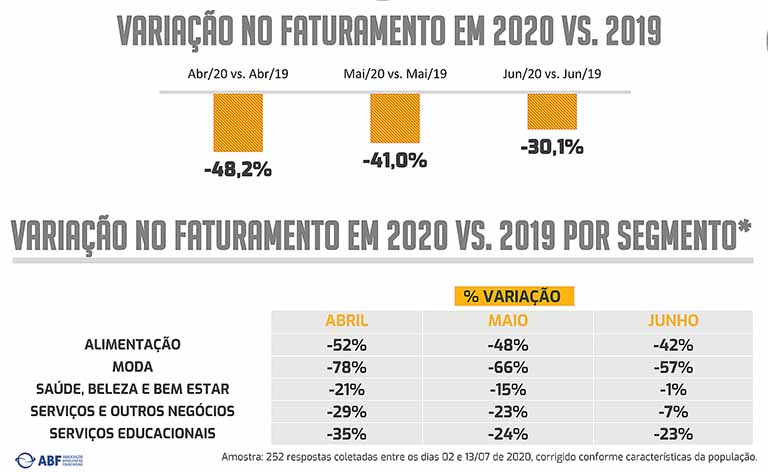 De acordo com estudo divulgado pela Associação Brasileira de Franchising e pela empresa de pesquisas AGP, o setor registrou, pelo segundo mês consecutivo, uma redução nas perdas de faturamento. Em junho, a queda média no faturamento das franquias foi de 30,1%, significativamente menor do que os 41% em maio e 48,2% em abril.