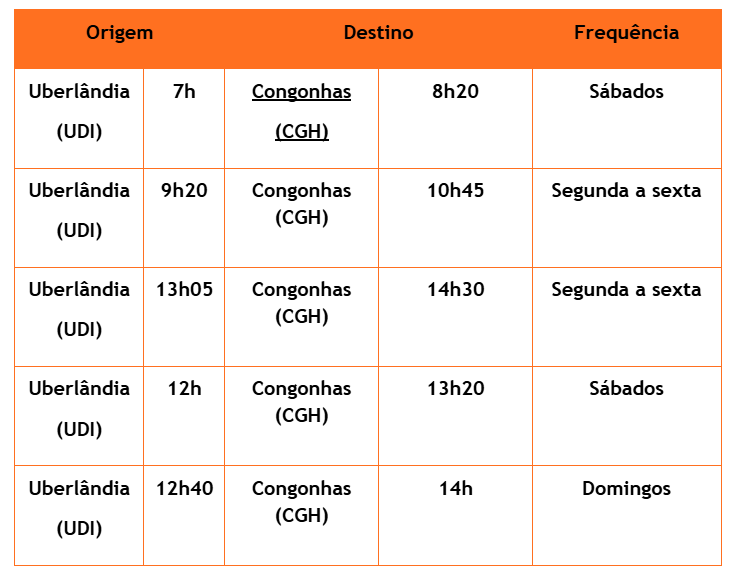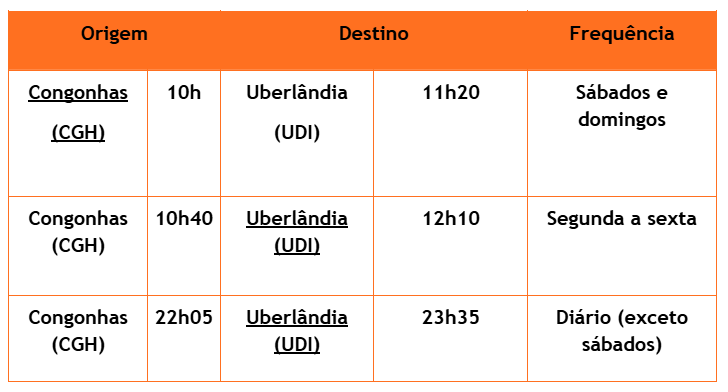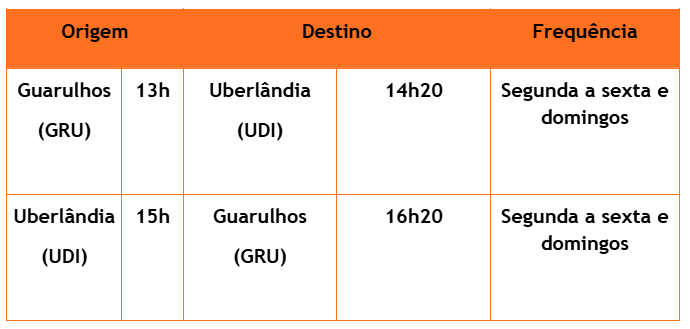 Além da nova rota no Triângulo Mineiro, a Gol vai dobrar a oferta de voos entre Uberlândia e São Paulo no Aeroporto de Congonhas (CGH). A companhia vai incluir um voo que parte de Uberlândia pela manhã, retornando no final da noite.