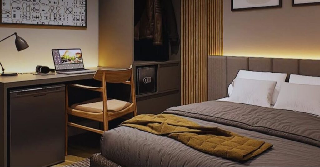 O hotel terá 45 unidades habitacionais e opções para diferentes perfis de estadia, incluindo quartos individuais, acomodações para casais e uma unidade adaptada para pessoas com necessidades especiais. As instalações priorizam funcionalidade e conforto, com itens essenciais para repouso de curta duração, como isolamento acústico, climatização e amenities completos.