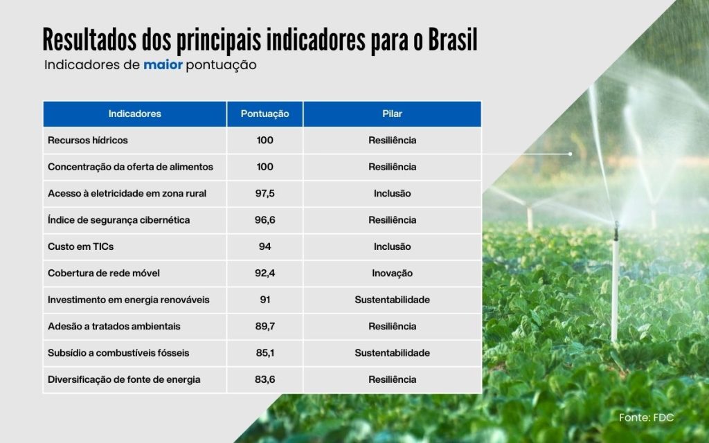 Na pesquisa “Futuro do Crescimento”, o Brasil apresenta alguns destaques positivos que podem potencializar um crescimento promissor frente a macrotendências, como, por exemplo, a disponibilidade de recursos hídricos (100) e a maior concentração de oferta de alimentos (100). A forte produção agrícola do País amplia a resiliência a eventos que impactam o suprimento desses recursos básicos.