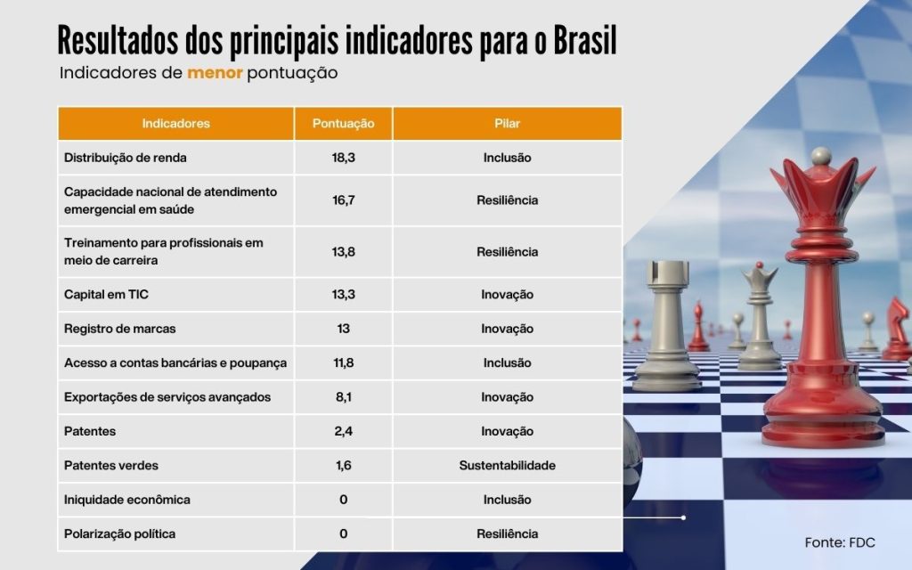 O Brasil, com PIB per capita PPP (paridade poder de compra) de USD$ 16.402 (cerca de R$ 81.000) considerado no relatório como um país do grupo de renda média alta, registrou, durante o período de 2018 a 2023, um crescimento de 1,22% no PIB. Em termos de qualidade desse crescimento, o País obteve pontuações de 41,8 em Inovação, 55,3 em Inclusão, 55 em Sustentabilidade e 52 em Resiliência.