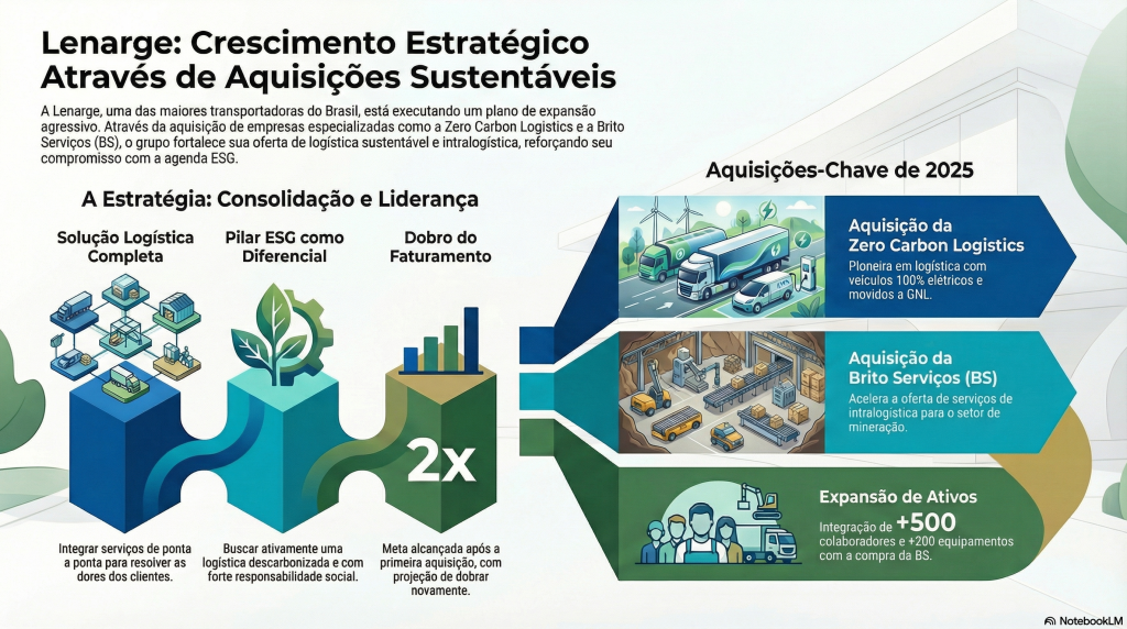 Essa aquisição foi a segunda realizada pela Lenarge em 2025. Em abril, o grupo adquiriu a Zero Carbon Logistics, referência em logística sustentável e pioneira na implementação de veículos 100% elétricos e movidos a Gás Natural Liquefeito (GNL), com sede em Belo Horizonte. Com isso, a empresa fortaleceu sua presença em soluções de transporte sustentável e ampliou para todo o Brasil serviços de armazenagem e transporte MRO (transporte de materiais necessários para a manutenção, reparo e operação de uma empresa) para os segmentos de mineração, siderurgia, agronegócio e indústria pesada.