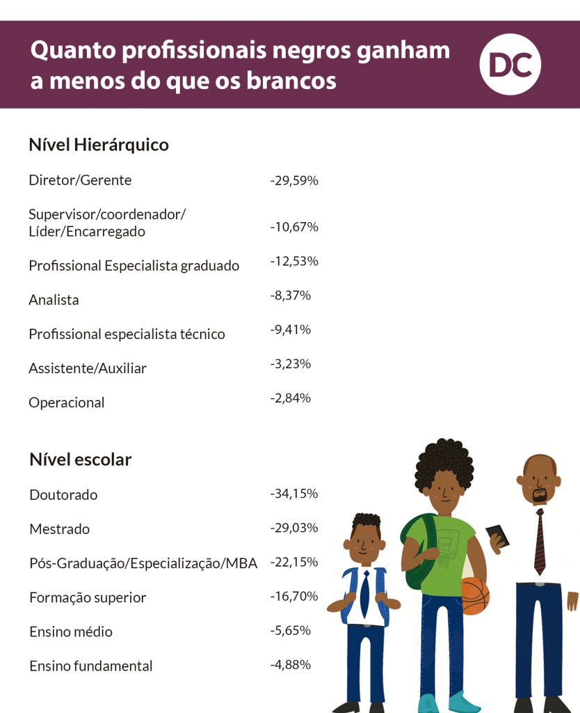 De acordo com o levantamento, os profissionais negros recebem menos do que os brancos em todos os níveis hierárquicos. Em cargos de diretoria esses profissionais ganham 29,5% a menos e a desigualdade segue em todos outros níveis de atuação: como Coordenador (-10,6%), Especialista graduado (-12,5%), Analista (-8,3%), Especialista técnico (-9,4%), Assistente (-3,2%) e Operacional (-2,8%).