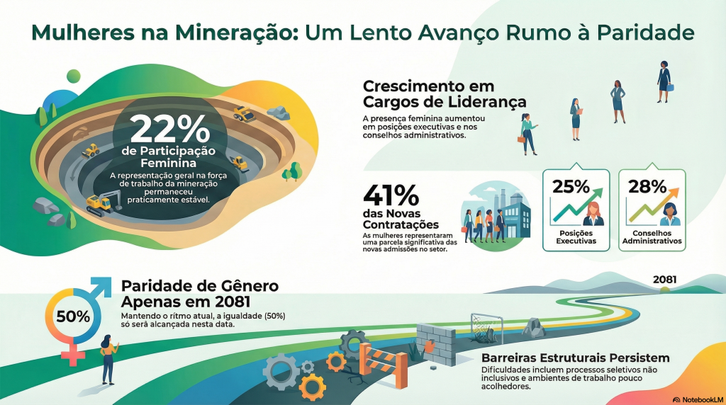 A 5ª edição do Relatório de Indicadores 2025 do Women In Mining Brasil (WIM Brasil), em parceria com a EY, divulgada na terça-feira (2), mostrou que a participação feminina na força de trabalho geral da mineração ficou estagnada em 22%. Apesar da estabilidade, houve avanços em áreas estratégicas, como o aumento de 3% na participação feminina em posições executivas, chegando a 25% do mercado, e de 17% em cadeiras em conselhos administrativos, somando 28% do setor.