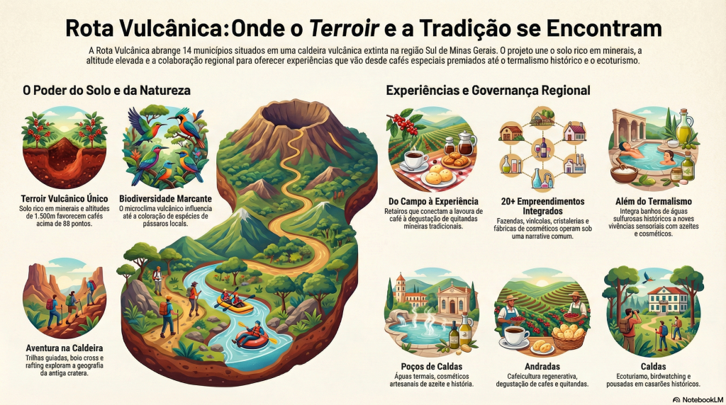 Em 2025, a Rota Vulcânica foi apresentada em seis feiras de turismo pelo Brasil. O terroir único propiciado pelo solo de origem vulcânica, associado ao microclima da região, faz o diferencial dos produtos agroindustriais e marca até a coloração dos passarinhos, garante o fundador da Caldas Adventure, receptivo da cidade de Caldas, que começou a operar em junho do ano passado, Rodrigo Morais.