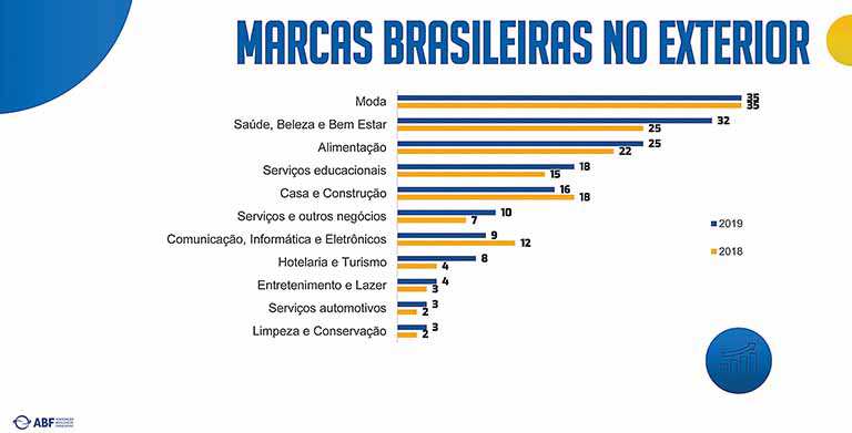 Internacionalização – Em 2019, 163 marcas brasileiras marcaram presença em 107 países. Aumento de 12% em relação ao ano anterior, quando foram registradas 145 marcas. Na liderança está o segmento de moda (35 marcas); seguido por Saúde, Beleza e Bem-Estar, que cresceu 28% no período (de 25 para 32 marcas); e Alimentação (25). Os países que mais recebem marcas brasileiras foram: Estados Unidos, Portugal e Paraguai.