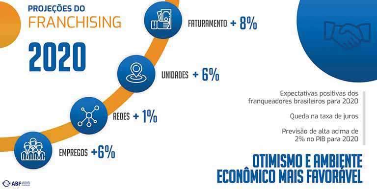 A Associação Brasileira de Franchising (ABF) em evento, ontem, em São Paulo, divulgou as projeções para 2020. Está previsto um crescimento de 8% no faturamento das franquias, um aumento de 6% nas unidades e 1% das redes e, também, um acréscimo de 6% em geração de empregos.
