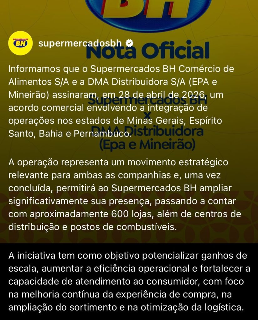 • Acordo entre Supermercados BH e Grupo DMA sinaliza consolidação no varejo alimentar