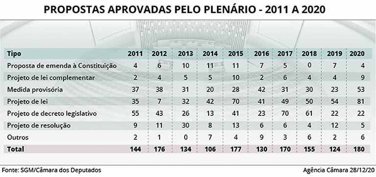Ao todo, o Plenário analisou e aprovou 81 projetos de lei, 53 medidas provisórias, 9 projetos de lei complementar e 4 propostas de emenda à Constituição em 2020. Aprovaram-se ainda 22 projetos de decreto legislativo e cinco projetos de resolução. No total, o ano foi o mais produtivo da década. O Plenário aprovou mais medidas provisórias e projetos de lei do que em qualquer outro ano desde 2011.