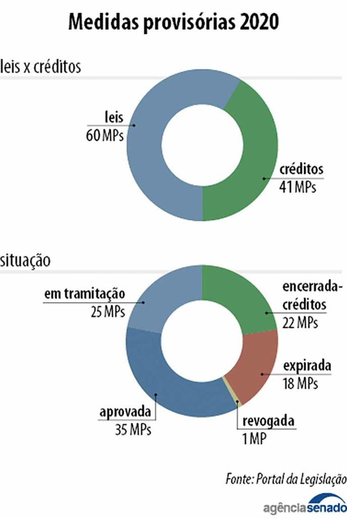 Em 2020 isso aconteceu, por exemplo, com a contratação temporária de servidores públicos aposentados (MP 922/2020), a mudança nas regras de acesso à informação durante a pandemia (MP 928/2020), a permissão para compartilhamento de dados cadastrais em empresas telefônicas com o IBGE (MP 954/2020) e a relativização da responsabilidade de gestores públicos durante a pandemia (MP 966/2020). (Agência Senado)