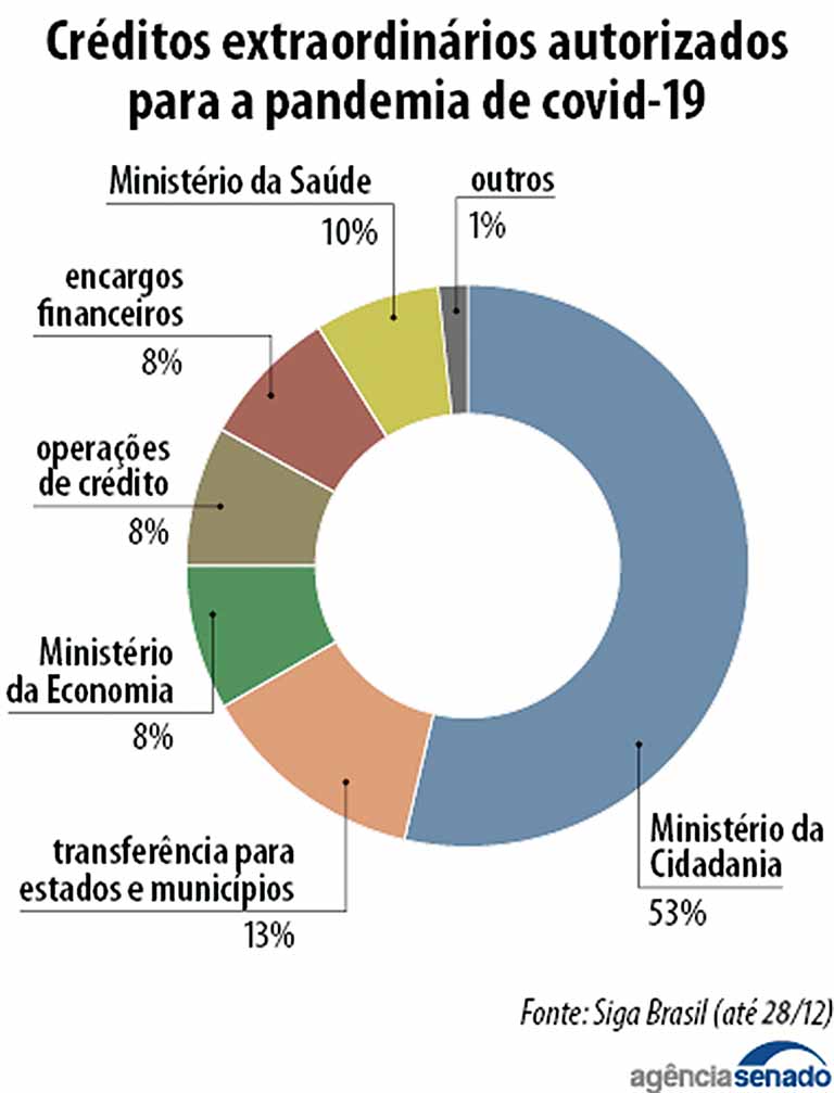 O Ministério da Cidadania foi o maior beneficiado por essas emissões, graças ao fato de ser o órgão do Executivo que administra o auxílio emergencial — de longe a política mais dispendiosa contra a pandemia de Covid-19 (Lei 13.982, de 2020). Mais de R$ 328 bilhões foram autorizados para a pasta, que usou cerca de R$ 297 bilhões. Para pagar o auxílio emergencial, foram cerca de R$ 231 bilhões.