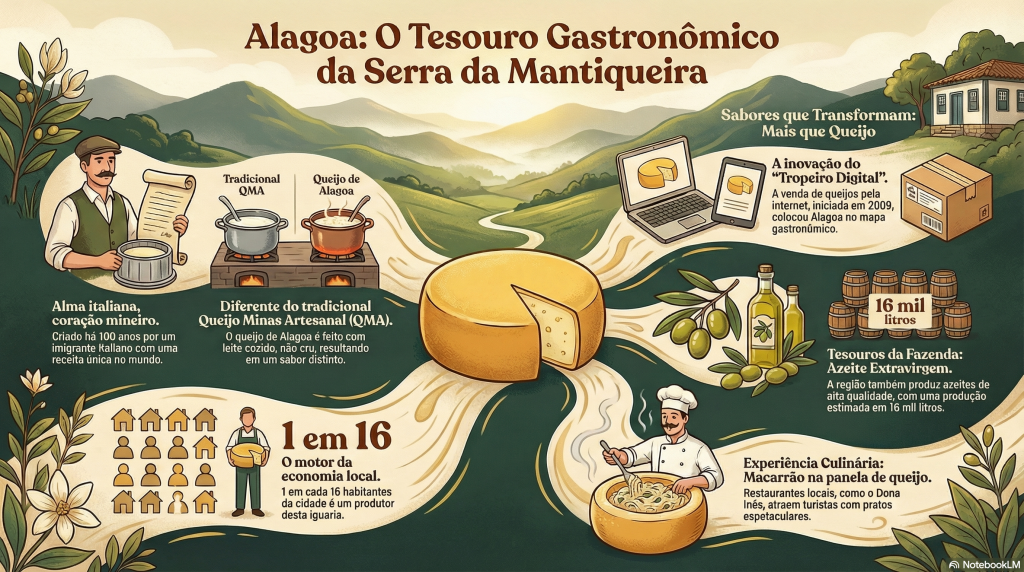 Aos 1,2 mil metros de altitude, em meio à natureza exuberante da Serra da Mantiqueira, revela-se Alagoa, uma típica cidadezinha do interior mineiro, onde o tempo passa lentamente e o povo trabalha duro, mas sempre encontra um jeito de prosear, oferecer um “cafezim” e um “pedacim” do seu maior tesouro: o queijo.