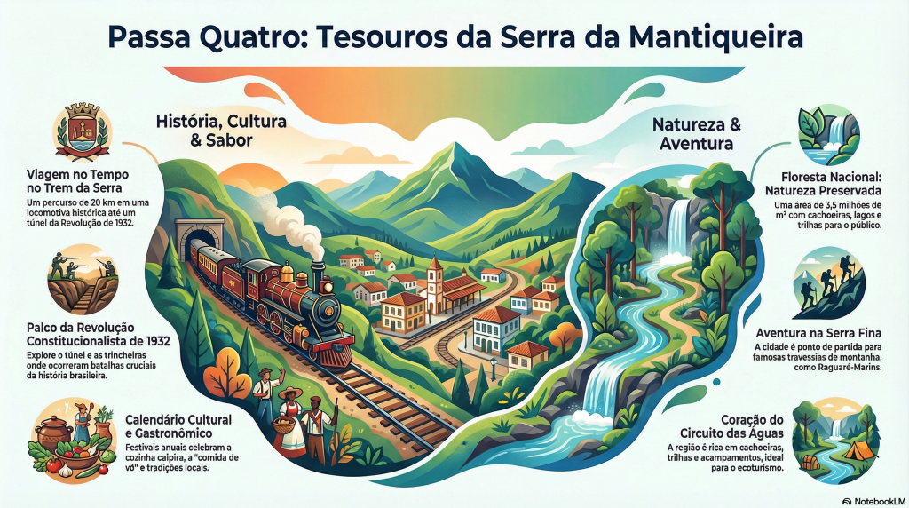 Entre os muitos atrativos, a cidade guarda no passeio de trem, talvez, a sua maior preciosidade, aquela que afaga de maneira especial o coração dos mineiros. O chamado “Trem da Serra da Mantiqueira” é operado pela Regional Sul de Minas da Associação Brasileira de Preservação Ferroviária (ABPF) e funciona nos fins de semana e feriados. Ele parte da estação central de Passa Quatro, construída em 1884, e segue em direção à Estação Coronel Fulgêncio, no alto da Serra, próxima ao Grande Túnel, na divisa entre os estados de São Paulo e Minas Gerais, totalizando 20 quilômetros (ida e volta). Durante o trajeto, um violeiro vai animando ainda mais o passeio.